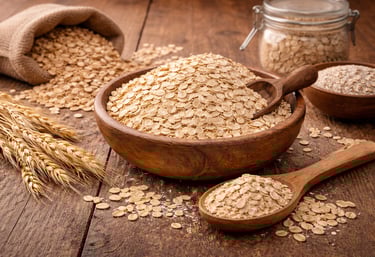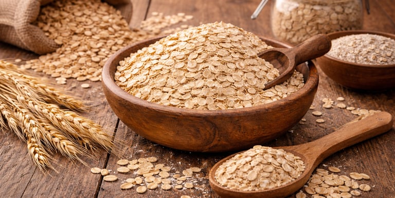 Flocons d'orge : grains d’orge aplatis après vapeur. Goût noisette doux, texture un peu ferme. Riches en fibres (bêta-glucanes), très digestes. Utilisations rapides : porridge, muesli, soupes crémeuses, galettes, pains, biscuits. Céréale saine et polyvalente.