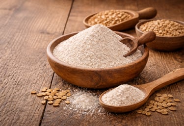Grains, floncons et farines biologiques, naturelles et soigneusement préparées